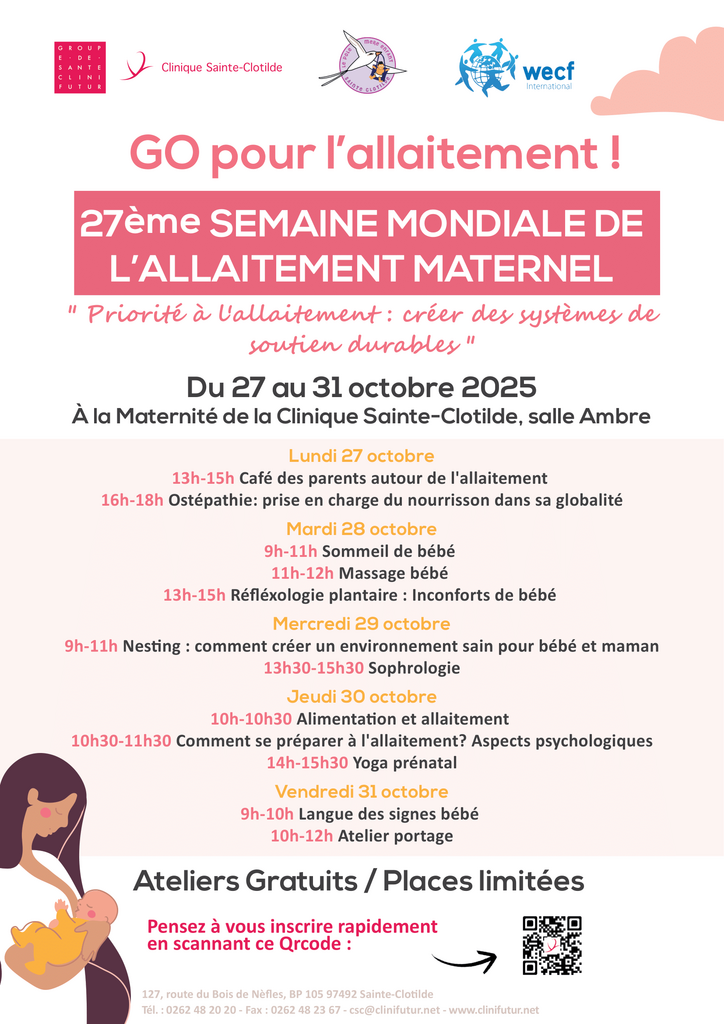 À l’occasion de la 27e Semaine Mondiale de l’Allaitement Maternel, la Clinique Sainte-Clotilde organise, une série d’ateliers gratuits à destination des futurs parents, jeunes parents et professionnels de la petite enfance.